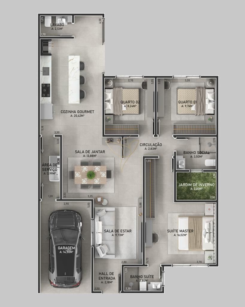 3 Dormitórios, sendo 1 suíte1 Banheiro1 VagaGaragem Coberta1 Lavabo1 Sala de jantar1 Área de serviço